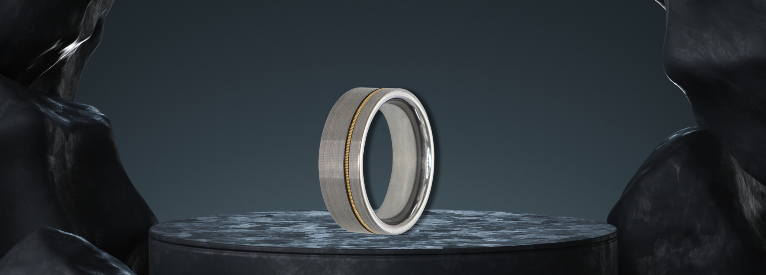 Save 25%Orpheus ring – Brushed Silver Tungsten with Gold Guitar String Inlay from The Hustler Collection. Angled view highlighting shape and finish.Orpheus ring – Brushed Silver Tungsten with Gold Guitar String Inlay from The Hustler Collection. Angled view with product name overlay.